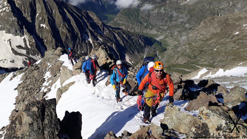 La montée au Gioberney est l’occasion de mettre en application les techniques apprises la veille sur l’encordement et le cramponnage, nous (les encadrants) étions au milieu des cordées de 3, et on laissait les stagiaires leader la cordée à tour de rôle. La montée finale au Gioberney fera aussi une première expérience de parcours d’arête en mixte (grimpe en crampons sur du rocher) !