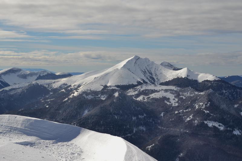 Dimanche matin, temps plus couvert. À partir des Amayères, montons au Chevalet par la forêt. Mais le soleil apparaît : laissons les chemins forestiers, allons vers les pentes dégagées. Vers le col de Jajène, sur l’itinéraire de Pointe Feuillette ? Non, plus sûr pour notre groupe : le col de Tournerond, par une belle pente pas trop raide, à la neige très soufflée. Du col, passage sur l’arête menant au Chevalet : belles sculptures de neige derrière chaque pin. Déjeuner au sommet, face à Pointe Feuillette, au Grand Ferrand, au roc de Garnisier. Puis retour par le même chemin (la descente par la forêt s’avérant trop raide, trop enneigée).